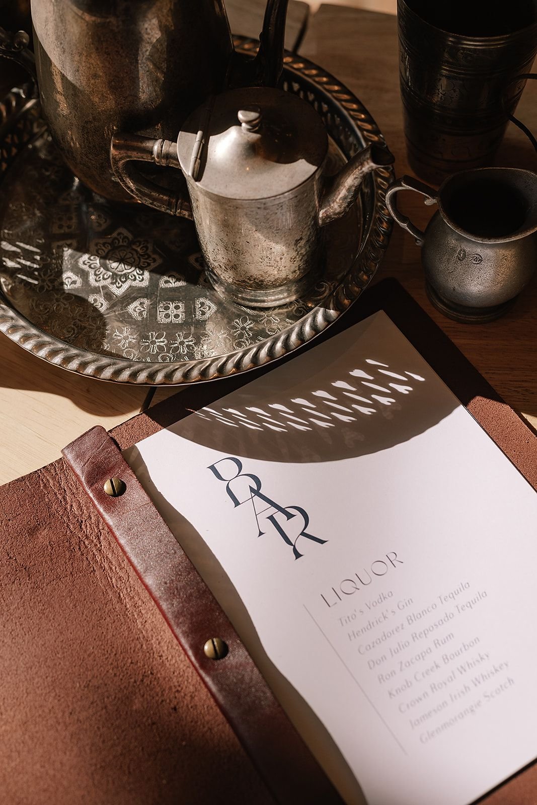 Marrakesh bar menu is inserted into a leather cover pressed with a custom logo.