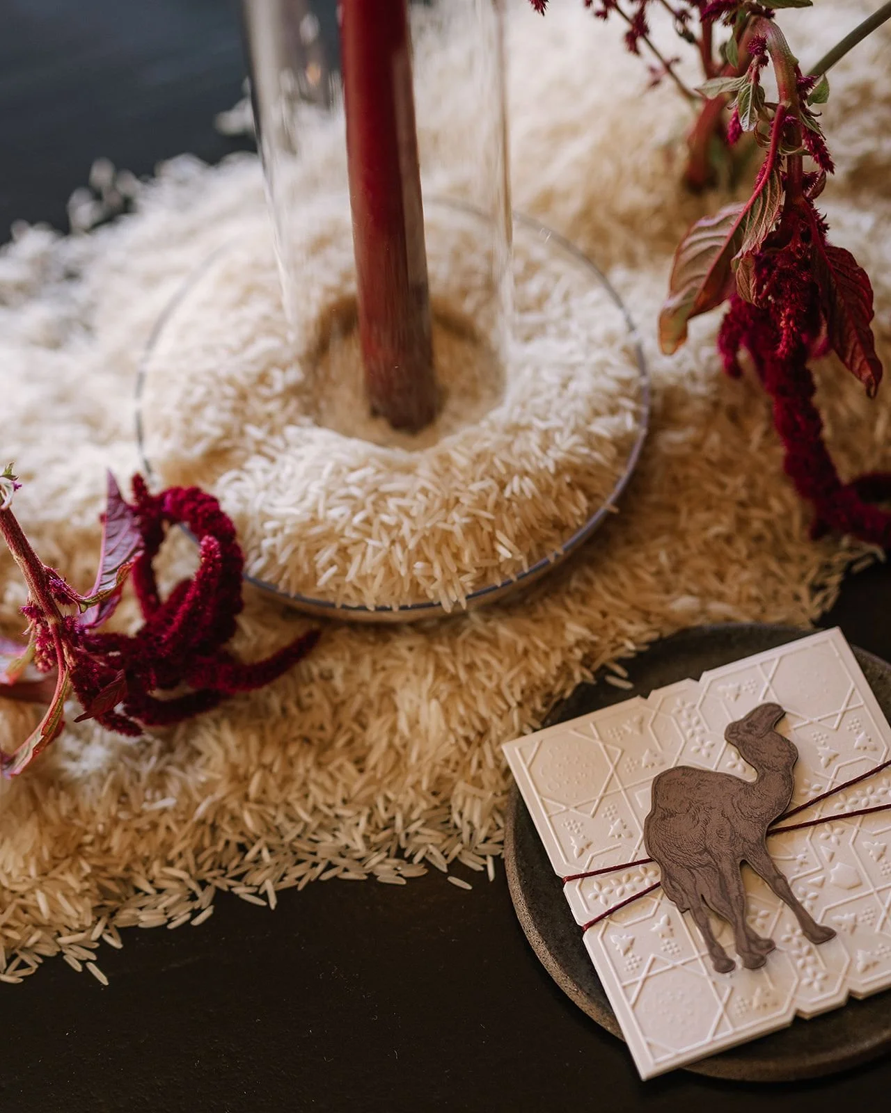 Texture, texture, texture. Blind embossed menu folders tied with burgundy cord, topped with laser cut animals shapes.