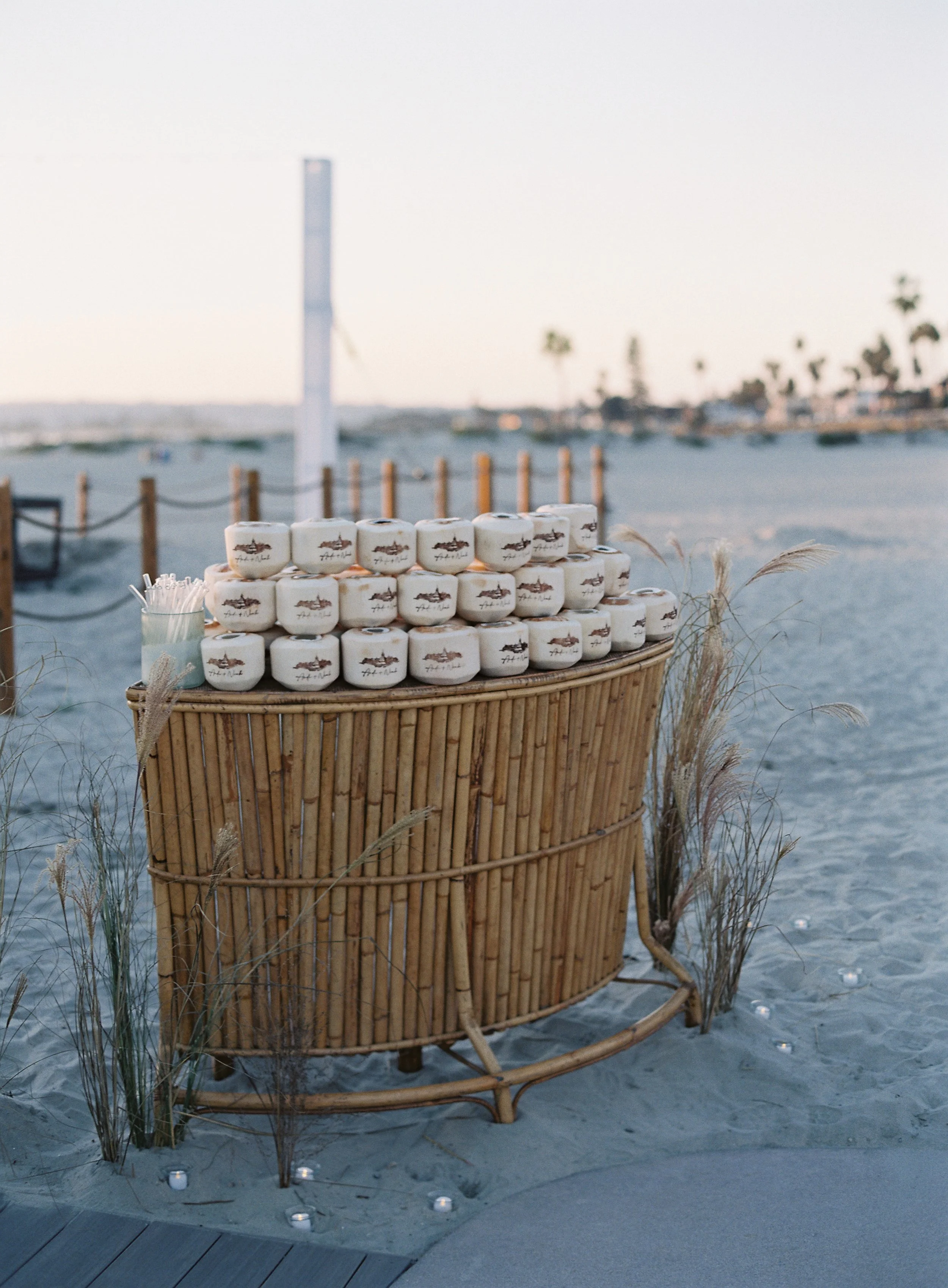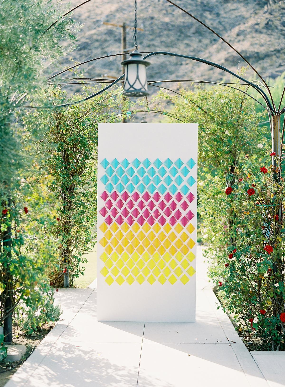 Multi-color custom die cut escort cards are pinned to hanging ribbons for a cheery Palm Springs wedding.