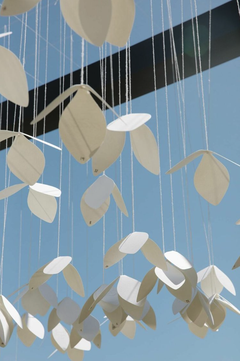 Soft and delicate floral escort cards are suspended from a robust, black structure.
