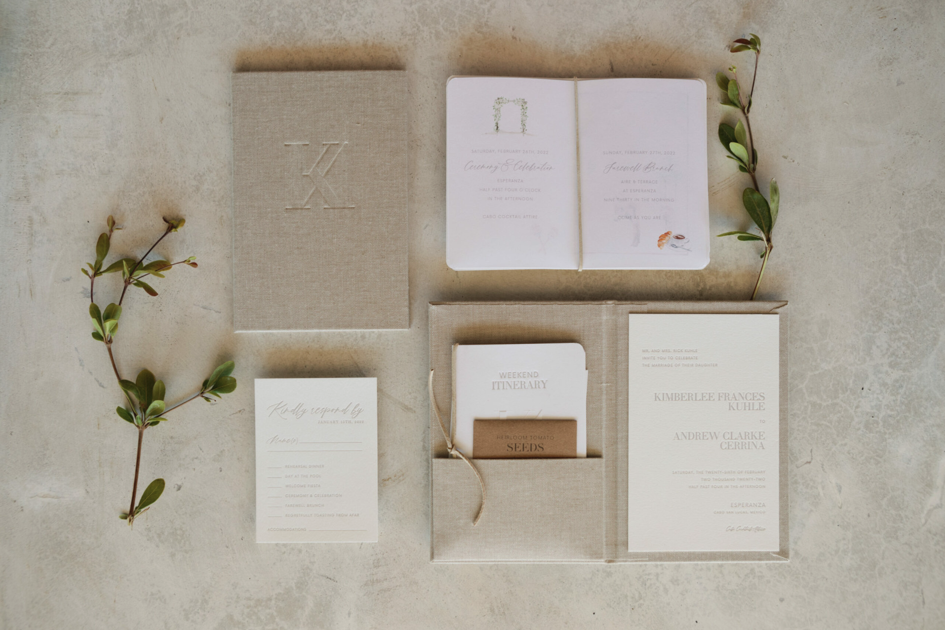 Clothed covered pocket folder with blind pressed monogram. Passport style itinerary and a packet of locally sourced tomato seeds.