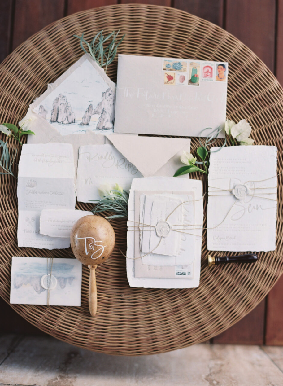 Custom illustration of skeleton couple with their pooch sets a refined and quirky tone for this boho Los Cabos wedding.